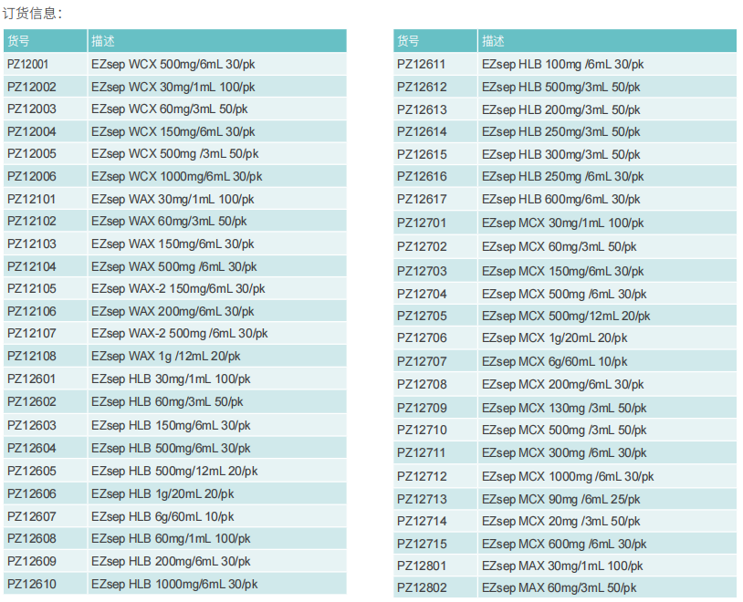 EZsepTM MAX:混合型強陰離子交換反相吸附劑,由HLB吸附劑鍵合季銨基團得到,兼具陰離子交換和反相兩種保留模式,適用于pKa值處于2-8之間的羧酸類化合物;